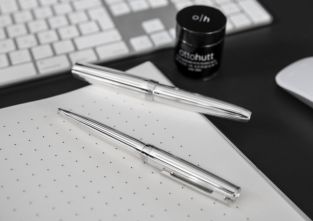 Noble materials, timeless design, excellent craftsmanship: with our flagship design07, it is obvious what makes Otto Hutt so special. The duo of fountain pen and rollerball pen is now matched by the twist ballpoint pen. This exclusive model comes made out of 925 sterling silver or with a platinum-plated barrel and cap, hand-painted in the color variant black transparent. Both variants are characterized by the sophisticated thread guilloche: a very discreet, classic pattern that is particularly appealing thanks to the precise processing.